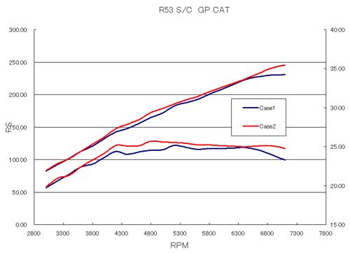 実は、JCW-GPについての実測データー上では、標準エキマニでもSACLAM製エキマニを装備してもDME(ECU)がSTD(標準)のままでは大差が無く、その効果を充分発揮できていない結果となりました。