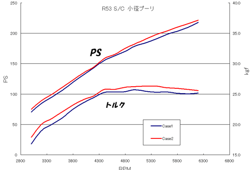 では、過給UPに於ける燃調はどうなっているのでしょうか? 海外モデルでは、小径プーリーと一緒に簡単なサブコン(モジュール)を販売しているところもあります。 しかしサブコンはECUの解析が出来ない場合の奥の手的な手法であって、ECUのMapが解析できる場合は、サブコンの有効性は極めて低いものになります。以下の性能グラフは、R53(S/C)に対して、社外の小径プーリーを装着したケースです。